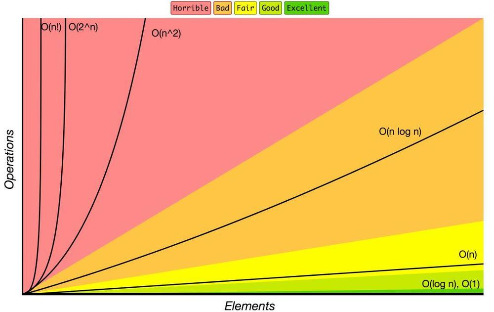 以下是一些最常用的 大O标记法 列表以及它们与不同大小输入数据的性能比较。