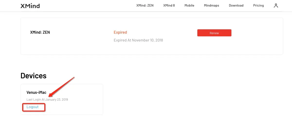 您可以使用XMind ID 登录我们的官方网站,您将看到有关已登录设备的信息。您可以注销以删除您的设备。