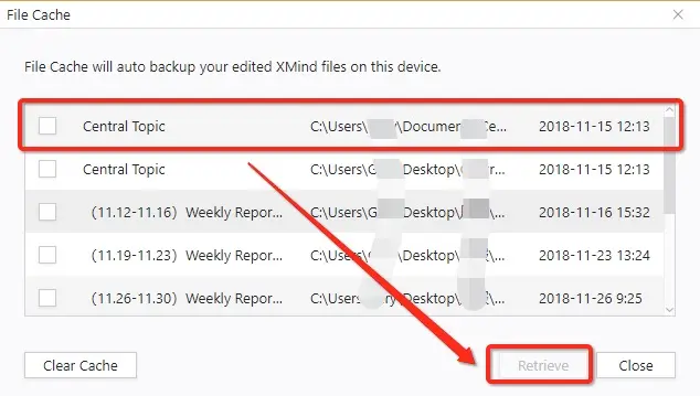 如果您无法打开文件,请尝试从文件缓存中查找备份文件。(请注意,只有9.1.0或更高版本支持文件缓存。)