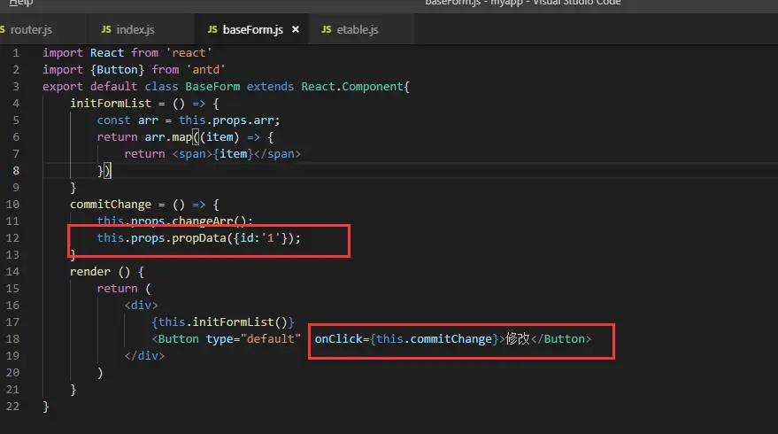 在BaseForm组件中能够通过this.props.arr获取到父组件传来的数组,通过this.commitChange向父组件传递一个事件