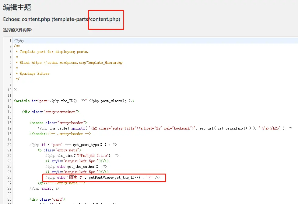 3. 将以下代码添加到要显示浏览次数的位置, 例如 文章列表(template-parts/content.php), 文章详情页面(template-parts/content-single.php), 搜索结果页面(template-parts/content-search.php)等。
