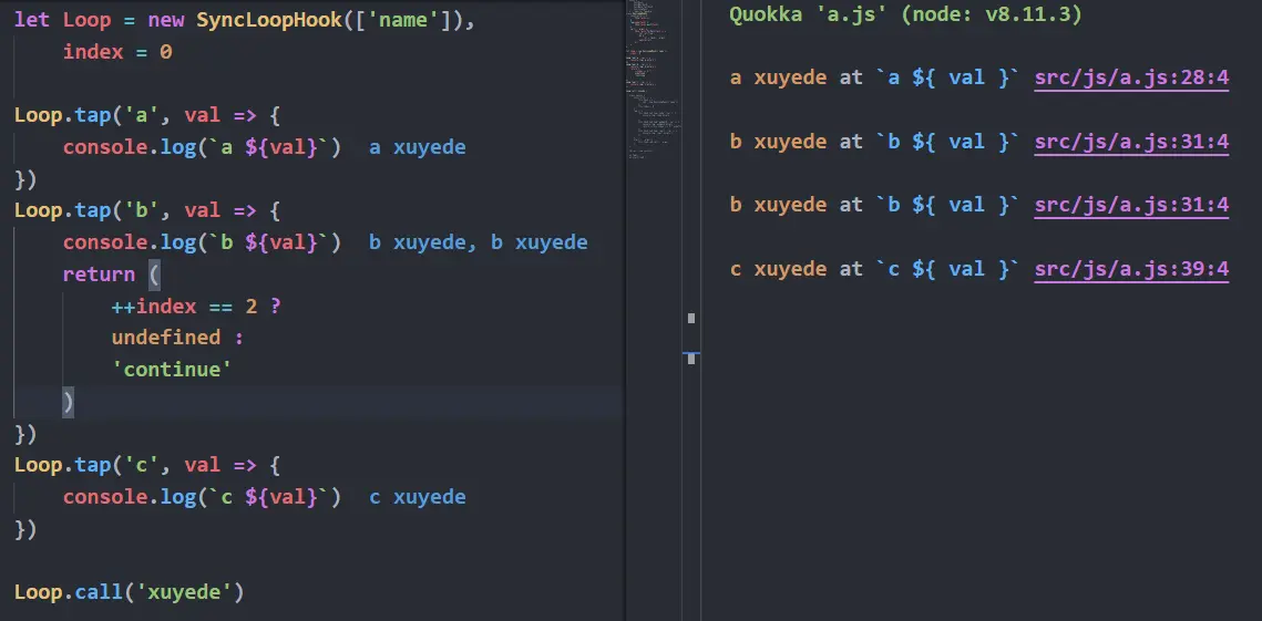 tapable里的SyncLoopHook是把包括return非undefined的回调函数和该回调函数之前的回调函数都循环一遍, 如下图