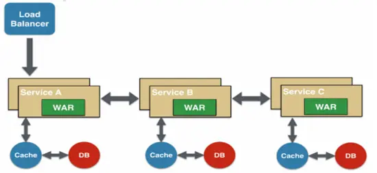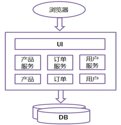 所有的功能打包在一个 WAR包里,基本没有外部依赖(除了容器),部署在一个JEE容器(Tomcat,JBoss,WebLogic)里,包含了 DO/DAO,Service,UI等所有逻辑。