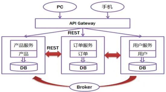 虽然REST设计模式非常流行,但它是同步的,会造成阻塞。因此部分基于微服务的架构可能会选择使用消息队列代替REST请求/响应,如下图所示: