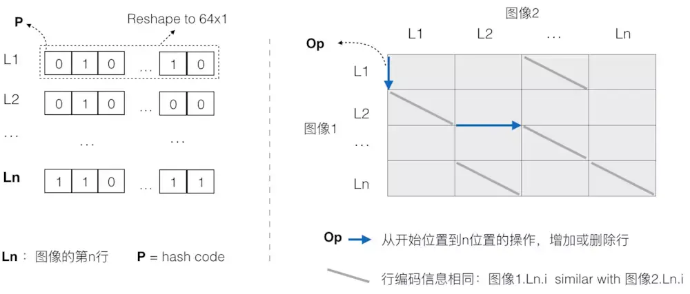 图像的表示状态定义了它如何去计算,Pixel-by-Pixel的问题在于它对图像的表示基于像素点,内容位置信息互相没有关联,为了让机器理解图像前后内容位置的更新,我们重新定义了图像的表示方式。首先对图像进行以行为单位的特征提取,参考均值Hash表示成二值的形式,这里是为了之后计算去掉单个像素的位置信息,算法可以在更“高层语义”的层面去对比两张图像。在两个图像的行特征关联计算的时候,二维的信息变成了一维,可以使用一维的数据算法做计算。在由行特征关联计算形成的编码状态表里寻找一条从左上角到右下角的最优路径,是图像1到图像2的转换过程,路径中的Op就是两个图像的增量部分。最优的路径是指,图像1转换到图像2的转换路径需要的最少操作。
