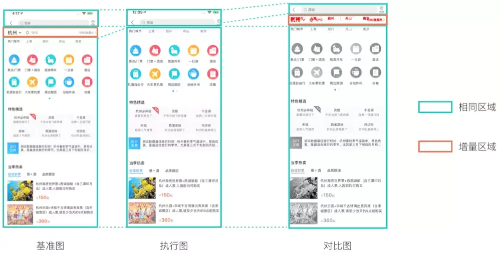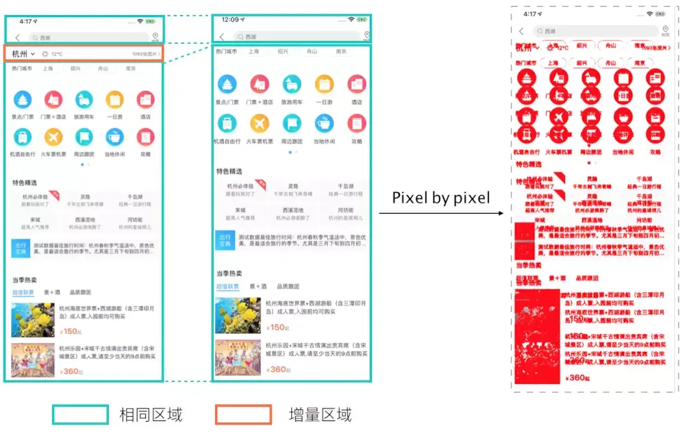 获得App页面的内容整体展示图像,我们可以使用配置好的基准图和当前的图像做对比。常见的图像对比算法为像素Pixel-by-Pixel的对比。基于像素的对比适用于两个参与对比的图像来自同一源,可以标记像素级的差异。然而在移动端的场景中,参与对比计算的图像在时间上来自不同的源,手机GPU渲染和页面排版存在像素位置的波动。我们发现,融合后的两个图像常会存在内容位置的差异,例如在连续相同的内容之间增加新的内容。在业务上这种情况体现在需求的更新或者增加相关的展示区域等情形下。内容位置的更新会使像素对比算法失效,对比图的信息不能参考。(可以看到下图中,如果采取传统像素对比算法,即使两幅图中仅有头部区域多出了城市信息,整版版面都将被标记为不同,无从聚焦在真实的不一致上)