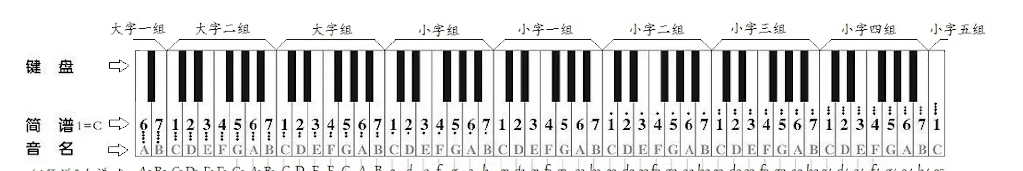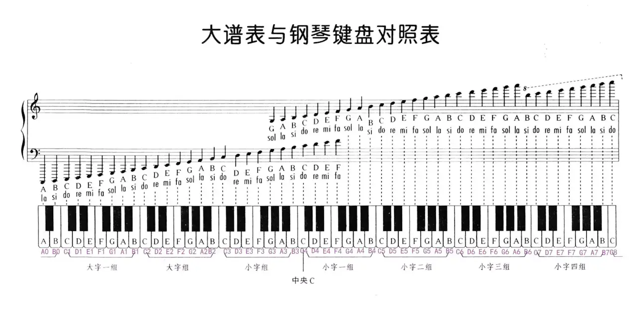 有人奇怪,最上面的图没显示大字二组、小字五组啊,那是因为那副图没显示全钢琴的88个键,不信你去数一数,最低部分和最高部分都被截去了一块,不然显示全,字太小了。
