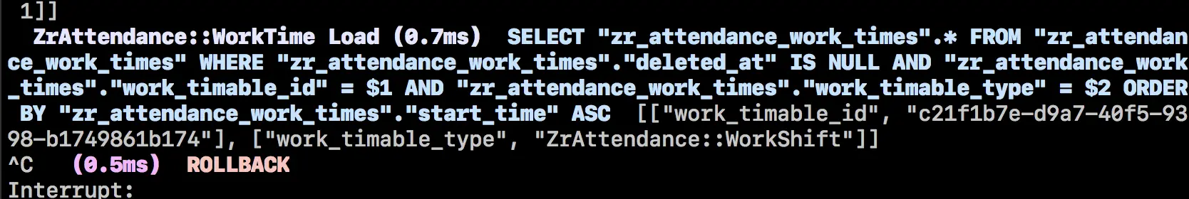 于是,根据代码,我们先从第二个点入手。第二个代码是创建一个请假记录的数据库记录,是一个标准的 Rails 实现,在执行过程中,我发现到这一条 SQL 时候,内存就开始暴涨,所以基本可以确定是这个问题。而另一个代码没有在 console 里面复现,却在跑测试用例的时候出现内存泄漏。考虑了一下,应该是 development 环境对应的数据里面没有跟 worktime 相关的内容,导致无法触发下面的 SQL。
