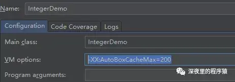 那我们再往上看一下IntegerCache,它是Integer的内部静态类,low默认是-128,high的值默认127,但是high可以通过JVM启动参数XX:AutoBoxCacheMax=size来修改(如图),如果我们按照这样修改了,然后再次执行上面代码,这时候2次输出都是true,因为缓存的区间变成-128~200了。