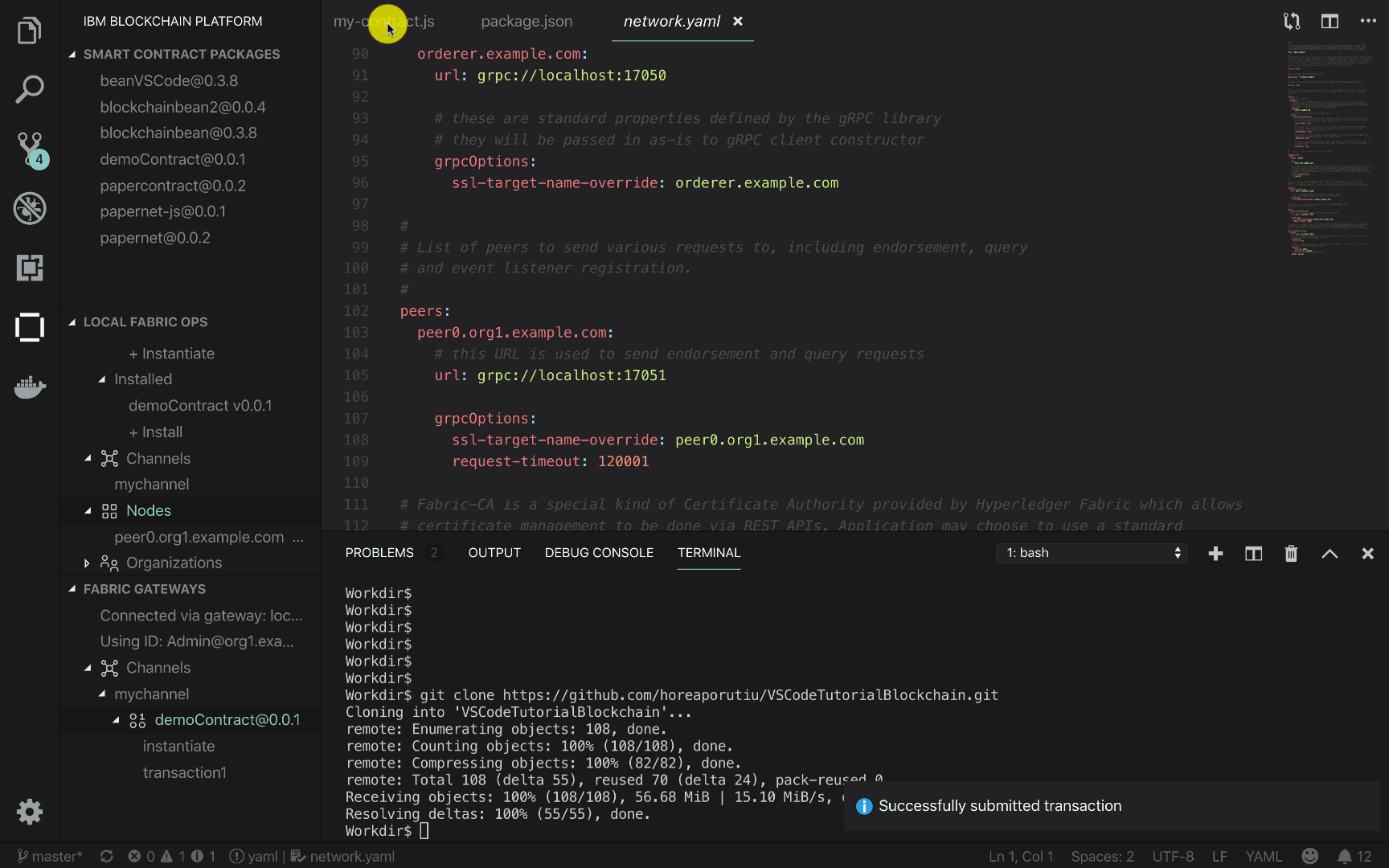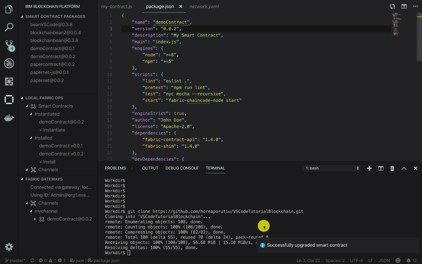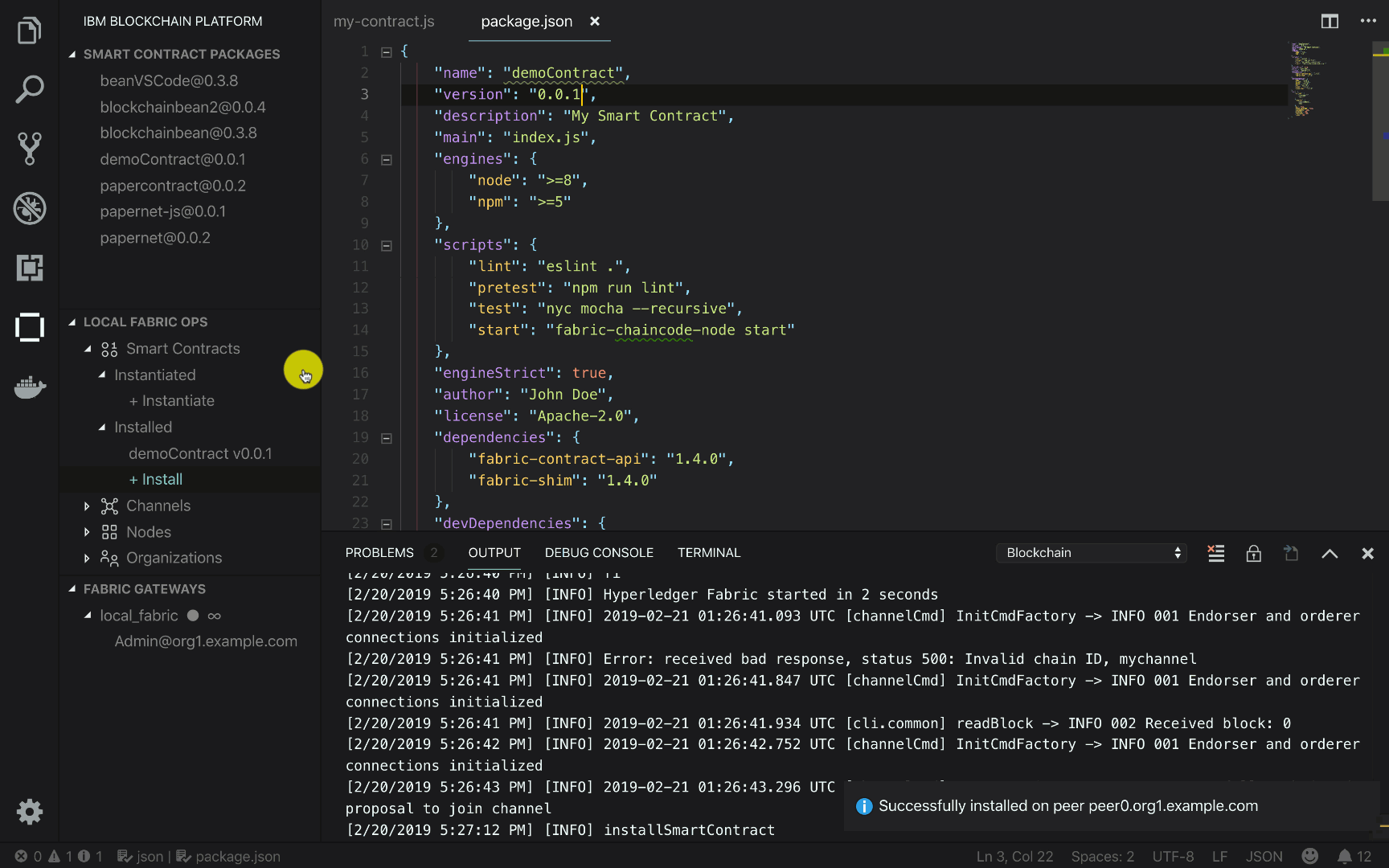 demoContract@0.0.1。如果一切顺利,你应该会在右下角看到通知:已成功安装在节点peer0.org1.example.com上就是这样!不错的工作!