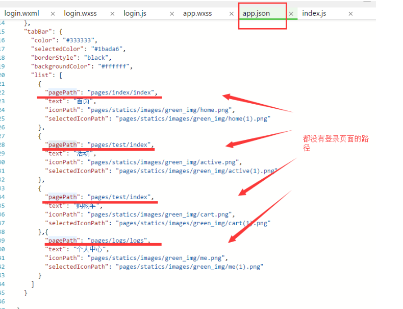 登录页面不显示tab Frank同志68687 2019-04-04 202 阅读1分钟 如果你不想在登录页有tabBar的内容,则在app.json 里面tabBar-->list-->pagePath 不能写登录页面的路径,并且首页跳转到登录页时,用 navigateTo 跳转到新页面即可实现tabBar的隐藏,如下图所示: