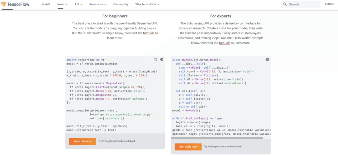 图中是 TensorFlow 2.0。网址:https://www.tensorflow.org/overview,你可以在该网页随意尝试这些橙色按钮。