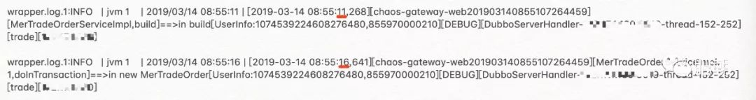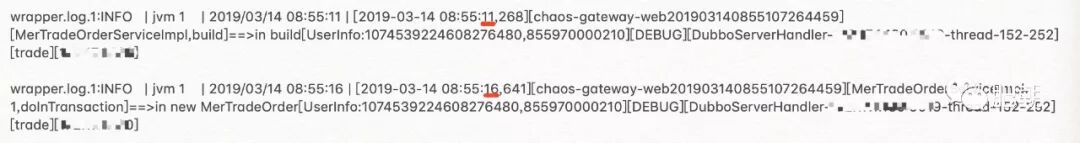 我们先不纠结为什么使用第三种,后面在讲事务传播机制的时候我会专门介绍,我们聚焦一下主题,你现在只要知道,那个是开启事务的意思就行了.我特意用红色和蓝色把日志代码圈起来,意思就是,进入方法的时候打印日志,然后开启事务后,再打印一个日志.一波压测之后,发现接口频繁超时,数据一致压不上去.我们查看日志如下: