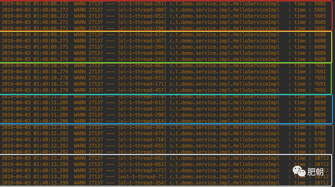 我们从本地调试的日志中,发现了大量超过5s的接口,并且还有一些规律,肥朝特地用不同颜色的框框给大家框起来