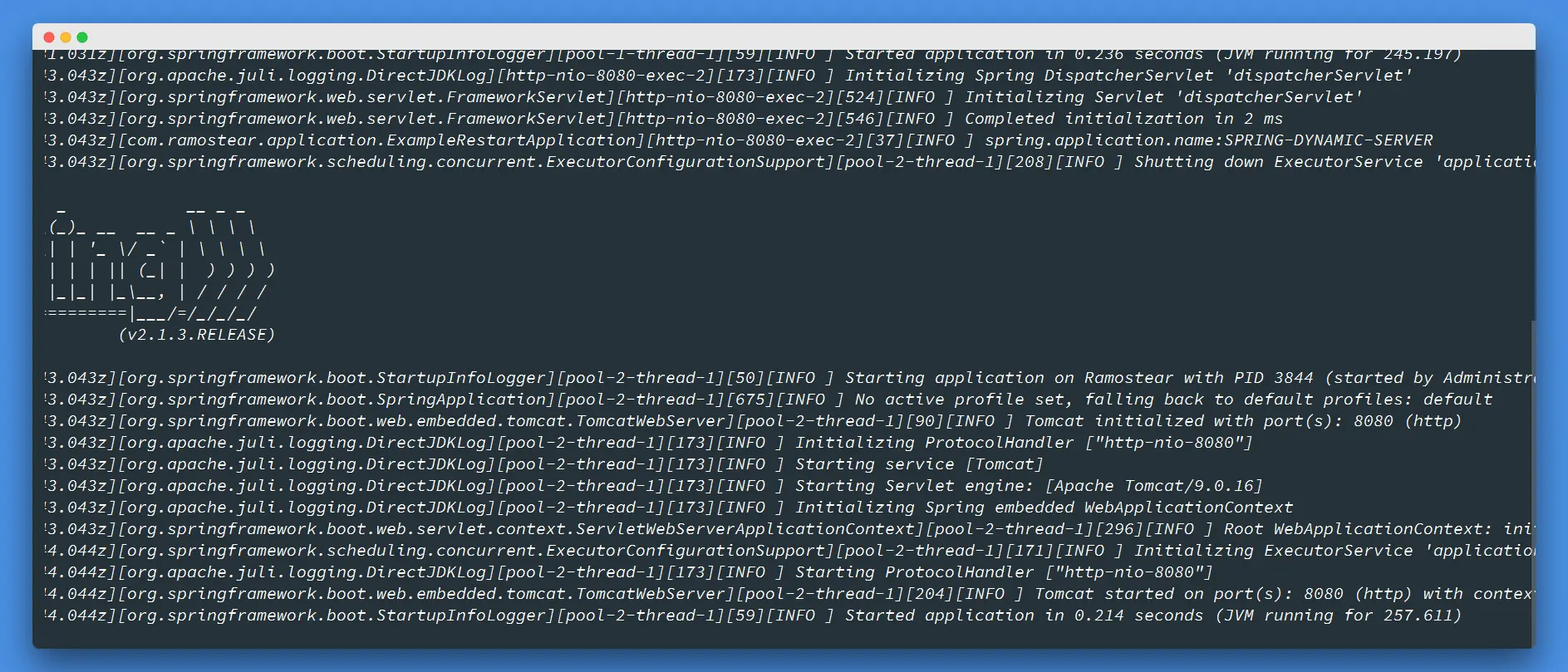 [2019-03-12T19:05:53.053z][org.springframework.boot.StartupInfoLogger][main][59][INFO ] Started ExampleRestartApplication in 1.587 seconds (JVM running for 2.058)
