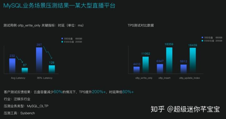 得益于ESSD对于IOPS性能的提升及针对链路延迟的降低,数据库将可以获得更高的性能,这对于企业级数据库应用系统在云上的运行能力将产生从量变到质变的提升。从实际的数据库压测效果看,ESSD云盘在性能升上对比SSD云盘有了大幅度的提升。
