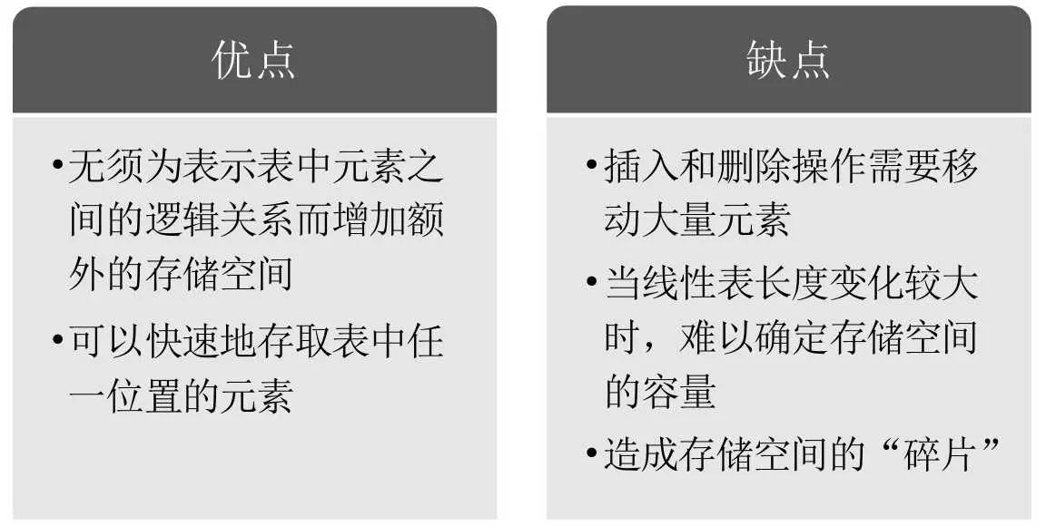 线性表的顺序存储结构,在存、读数据时,不管是哪个位置,时间复杂度都是O(1);而插入或删除时,时间复杂度都是O(n)。