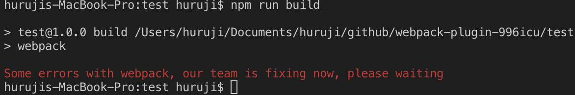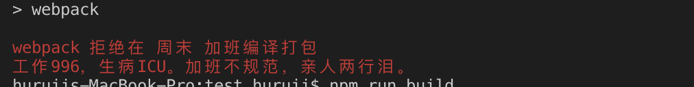这款插件是为了呼应 996ICU 这个项目,让 webpack 在非工作时间(每天 9 点之前、18 点之后和周末)拒绝编译打包。在拒绝 编译打包 时运行的截图如下: