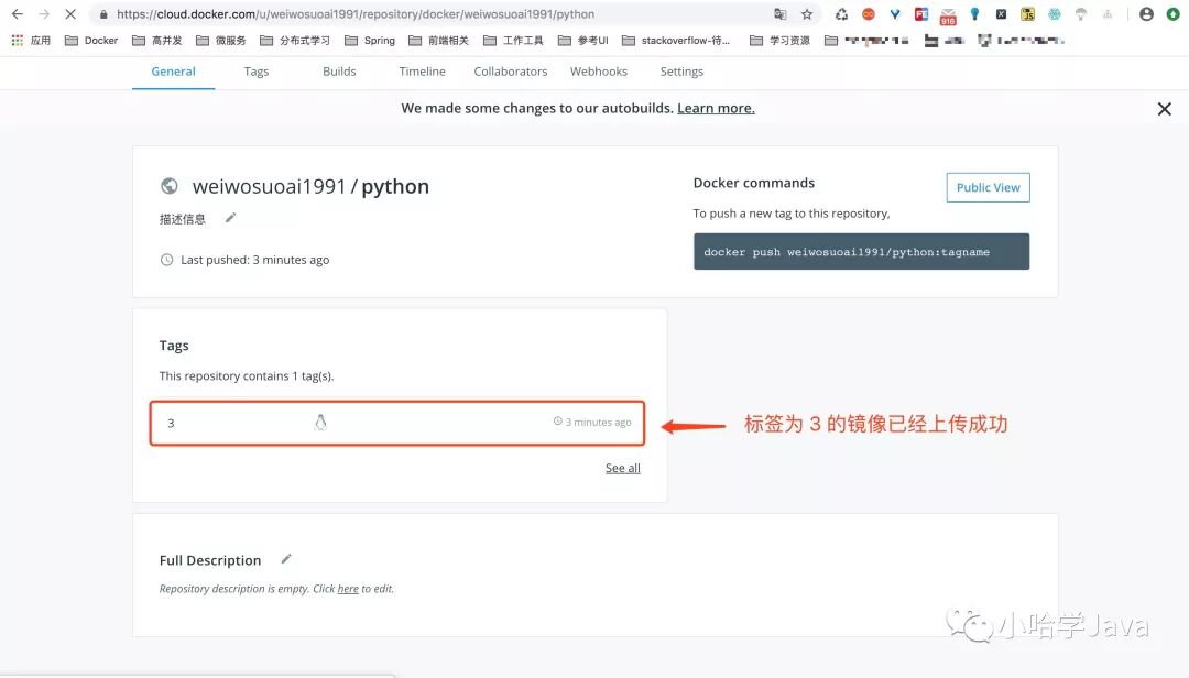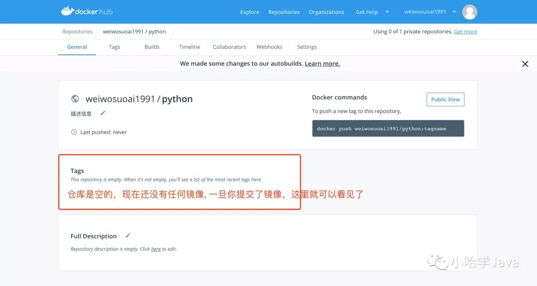 上传成功!去 Docker Hub 官网,新创建的仓库的信息页面验证一下,是否真的成功了: