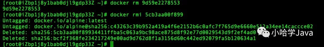 当通过该镜像创建的容器未被销毁时,镜像是无法被删除的。为了验证这一点,我们来做个试验。首先,我们通过 docker pull alpine 命令,拉取一个最新的 alpine 镜像, 然后启动镜像,让其输出 hello,docker!: