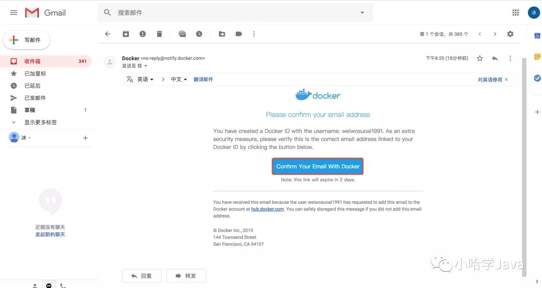 接下来,Docker Hub 会发送验证邮件,到您填写的邮箱当中: