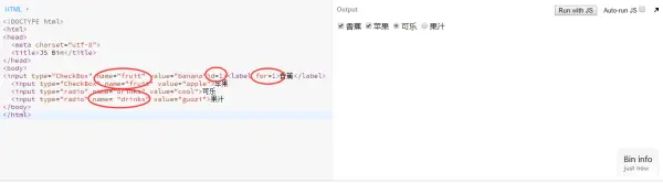 <input id="xxx"><lable for="xxx">(内容)</lable>实现 - CheckBox和radio都可以设置name值,name值表示请求时附带的参数。但是二者唯一不同之处是当radio的多个选择的name值相同时,只能够选择一个选项。