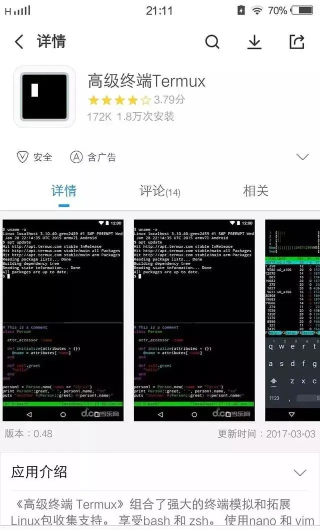 下载Termux,这个也直接在手机应用中搜索就行,如下,直接点击安装就行: