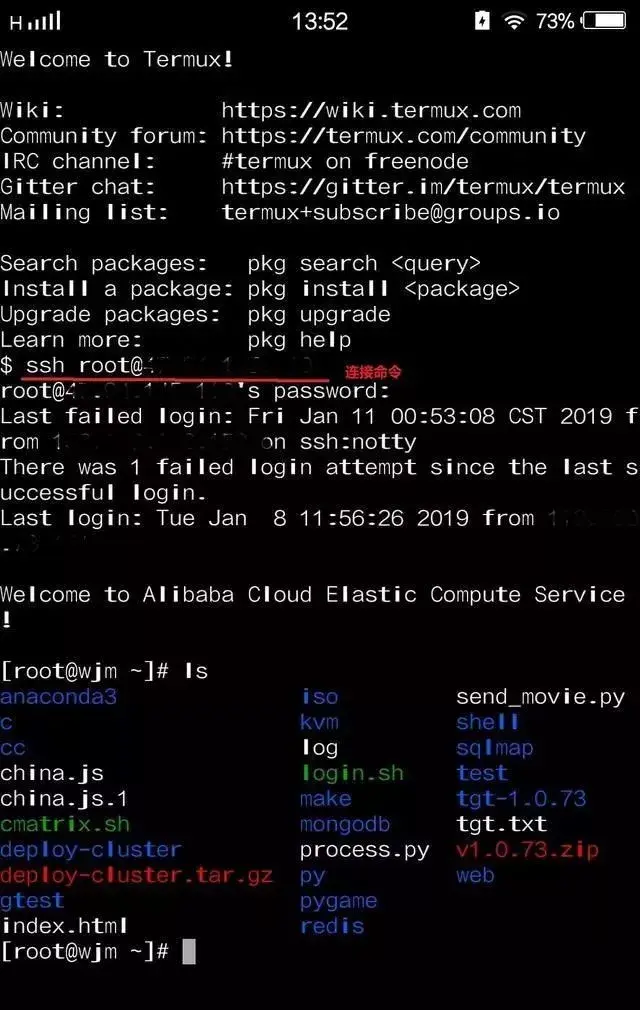 安装ssh后,可以直接在手机上远程登录Linux服务器,如下: