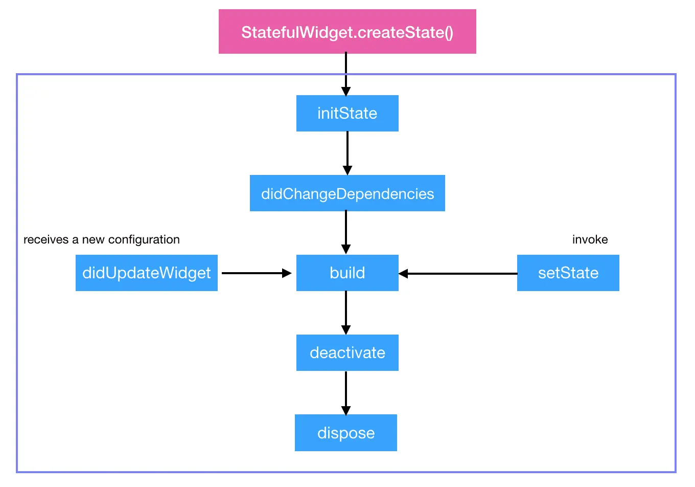 super.dispose()。didUpdateWidget(covariant T oldWidget)当 widget 的配置发生变化时,会调用这个函数。