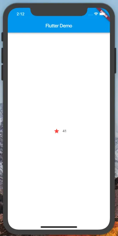 class _FavoriteStatefulWidgetState extends State<FavoriteStatefulWidget> { bool _isFavorited = true; int _favoriteCount = 41; void _toggleFavorite() { // 通过 setState() 更新数据 // 组件树就会自动刷新了 setState(() { if (_isFavorited) { _favoriteCount -= 1; _isFavorited = false; } else { _favoriteCount += 1; _isFavorited = true; } }); } // 重写 build() 函数,构建视图树 @override Widget build(BuildContext context) => Row( mainAxisSize: MainAxisSize.min, children: [ Container( padding: EdgeInsets.all(0), child: IconButton( icon: (_isFavorited ? Icon(Icons.star) : Icon(Icons.star_border)), color: Colors.red[500], onPressed: _toggleFavorite, ), ), SizedBox( width: 18, child: Container( child: Text('$_favoriteCount'), ), ), ], ); }使用这个自定义的 StatefulWidget 看看效果。