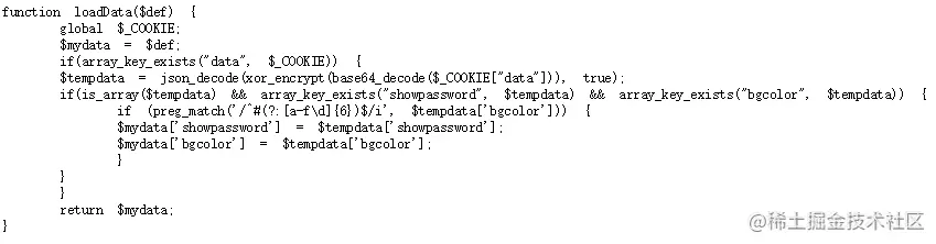 xor_encrypt(). In the code above, $d is the $defaultdata = array( "showpassword"=>"no", "bgcolor"=>"#ffffff");. Because it's a xor encryption, it's easy to get the $key by: