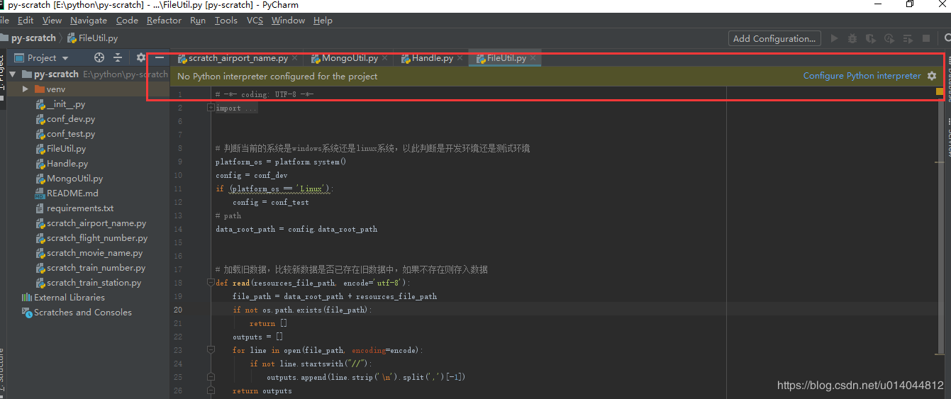 解决办法是:直接点击此提示框右侧的:Configure Python interpreter 跳转设置去选择解释器