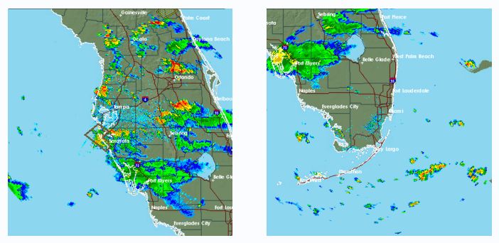 右边的雷达图是迈阿密雷达站在下午 4:53 拍摄的,跟右图存在了两分钟的差异,(我把这种情况称之为 glare)当我们把这两个雷达图铺叠在地图上的时候,你不会发现有什么不对的地方,但是,如果这两个图片之前的延迟不止几分钟的时候,我们裸眼就能看出有很大的区别。