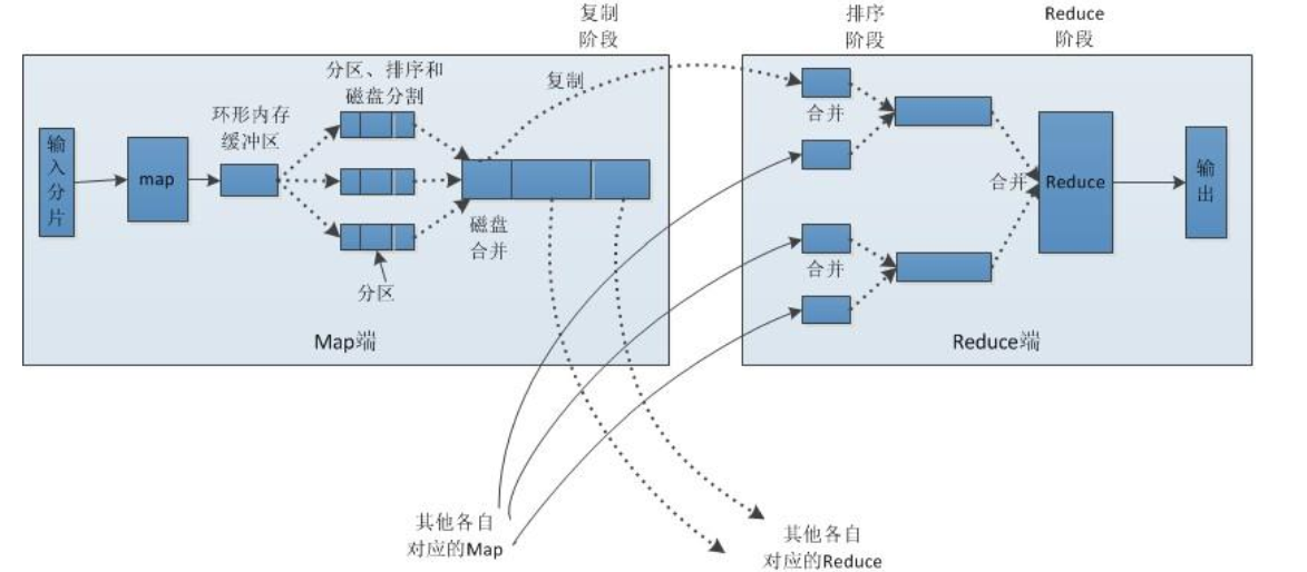 合并的过程中会产生许多的中间文件(写入磁盘了),但 MapReduce 会让写入磁盘的数据尽可能地少,并且最后一次合并的结果并没有写入磁盘,而是直接输入到 reduce函数。合并的时候