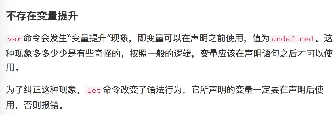 随着es6的出现,let开始用的越来越多,但是有个疑惑一直困扰着我,var是有变量提升的,那么let到底有没有变量提升,这是阮一峰的ECMAScript 6 入门中的一句话: