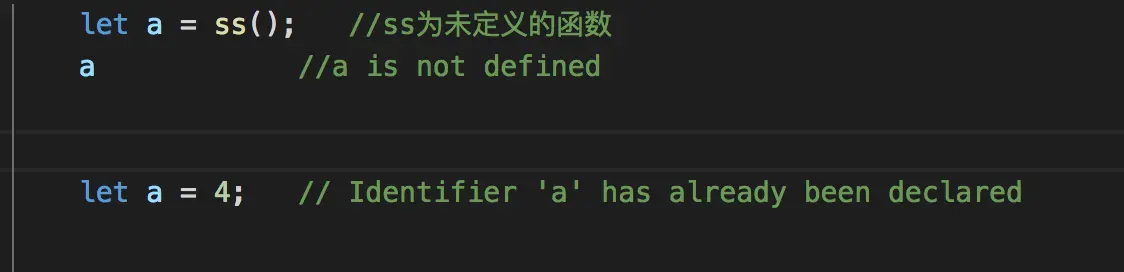 那么问题就来了 a是一个未定义的变量,那么let a = 4为什么会报已经重复定义的错。 应该是因为:let也有变量提升,在编译阶段,a就被声明了两次,所以会报重复定义的错,但是let和var的变量提升又不太一样