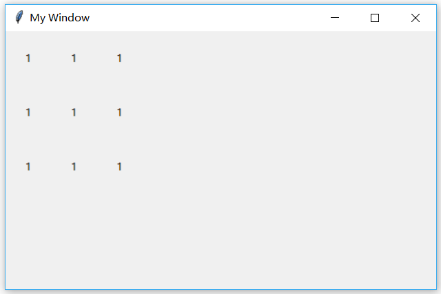以上的代码就是创建一个三行三列的表格,其实 grid 就是用表格的形式定位的。这里的参数 row 为行,colum 为列,padx 就是单元格左右间距,pady 就是单元格上下间距,ipadx是单元格内部元素与单元格的左右间距,ipady是单元格内部元素与单元格的上下间距。