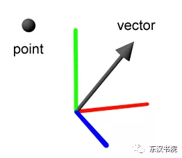 在这里,一个点表示的是三维空间中的位置。一个向量则通常表示的是一个三维空间中的方向。向量可以想象成为一个指向任意方向的箭头。三维的点和向量当然会有相似的地方,那就是他们都可以表示成三个数字组成的一组数据: