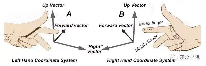 为何叫他们左手坐标系和右手坐标系呢?不妨掏出你的玉手,摆出图中的pose,是不是很屌。
