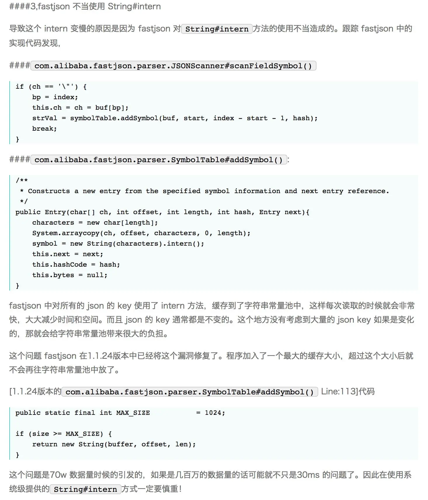 另外,FastJSON 在 1.124 版本之前也使用 String#intern(...) 方法,优化 JSON Key 的速度和空间,但是在大量动态 JSON Key 的场景下,反而会导致性能下降。所以 FastJSON 1.124 修复了该问题。参见如下: