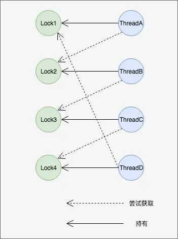 线程1等待线程2释放锁,线程2等待线程3释放锁,线程3等待线程4释放锁,线程4等待线程1释放锁.