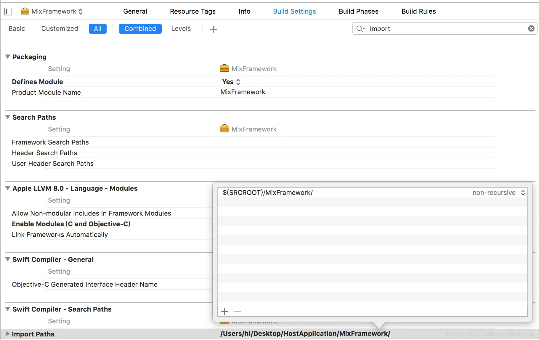 后一步操作是把module.modulemap的路径添加到Build Settings的Import Paths中,这是为了让我们在Swift里面import这个module的时候能够找到目标.