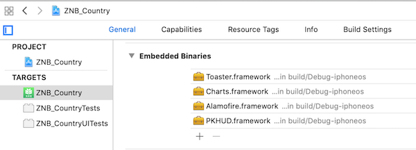2-3.点击工程->TARGETS->General -> Embedded Binaries -> + ,选择Charts.framework,导入framework;然后把Build Settings->Build Options->Always Embed Swift Standard Libraries的值设置成YES