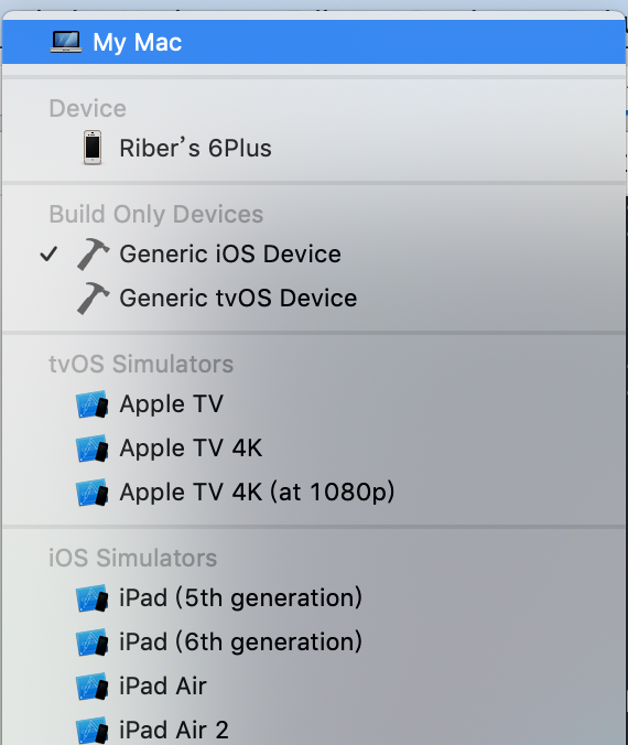 2.如果这时候你发现你的工程Scheme运行的设备多出了My Mac和Build Only decices多出了Generic tcOS device