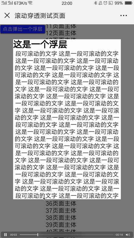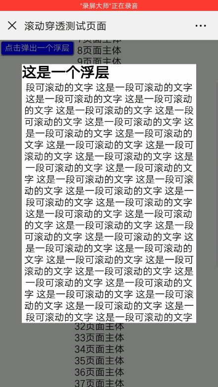 大功告成! 突然想到,如果浮层中还需要滚动那就不GG了! so,是不是可以有选择性的禁止滚动(在浮层中元素滚动到最顶部或者最底部之后禁止滚动)。 单独处理浮层中需要滚动的元素;