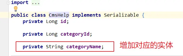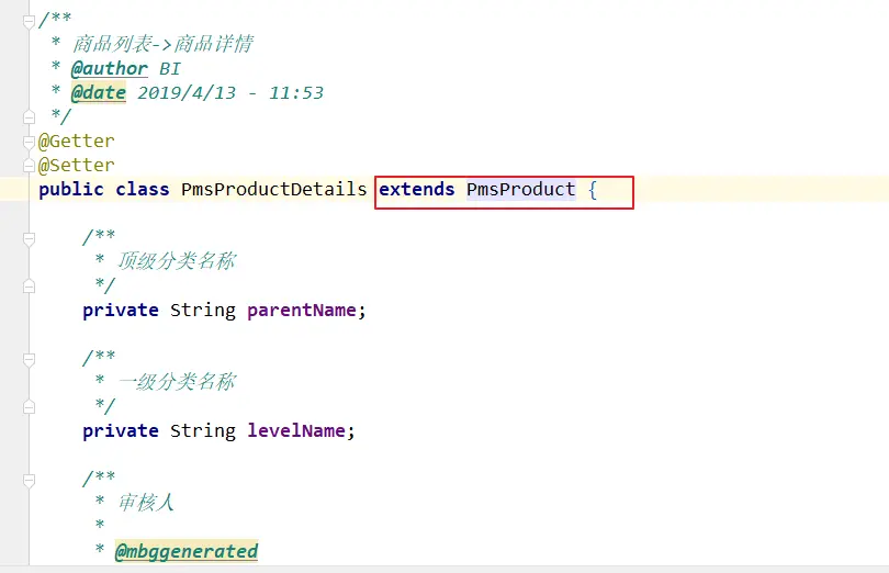 因为另外表的字段不多而且是基于商品表(pms_product)加上的,所以要在商品表的实体类上加上对应的字段,上面就是在商品类里面直接加了,这样等于修改原来的实体类,个人感觉不是很好,于是就另外写了一个类继继承商品表的实体类