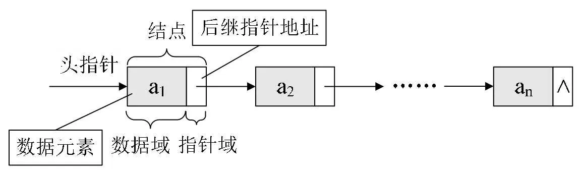 n个结点(ai的存储映像)链结成一个链表,即为线性表(a1,a2,...,an)的链式存储结构,因为此链表的每个结点中只包含一个指针域,所以叫做单链表。