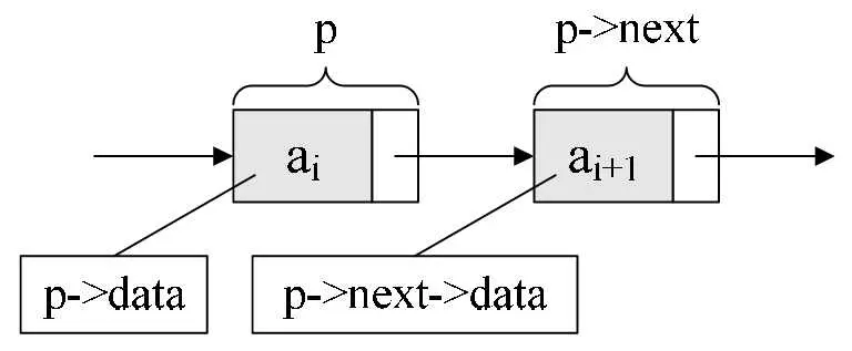结点由存放数据元素的数据域和存放后继结点地址的指针域组成。假设p是指向线性表第i个元素的指针,则该结点ai的数据域我们可以用p->data来表示,p->data的值是一个数据元素,结点ai的指针域可以用p->next来表示,p->next的值是一个指针。p->data=ai,p->next->data=ai+1