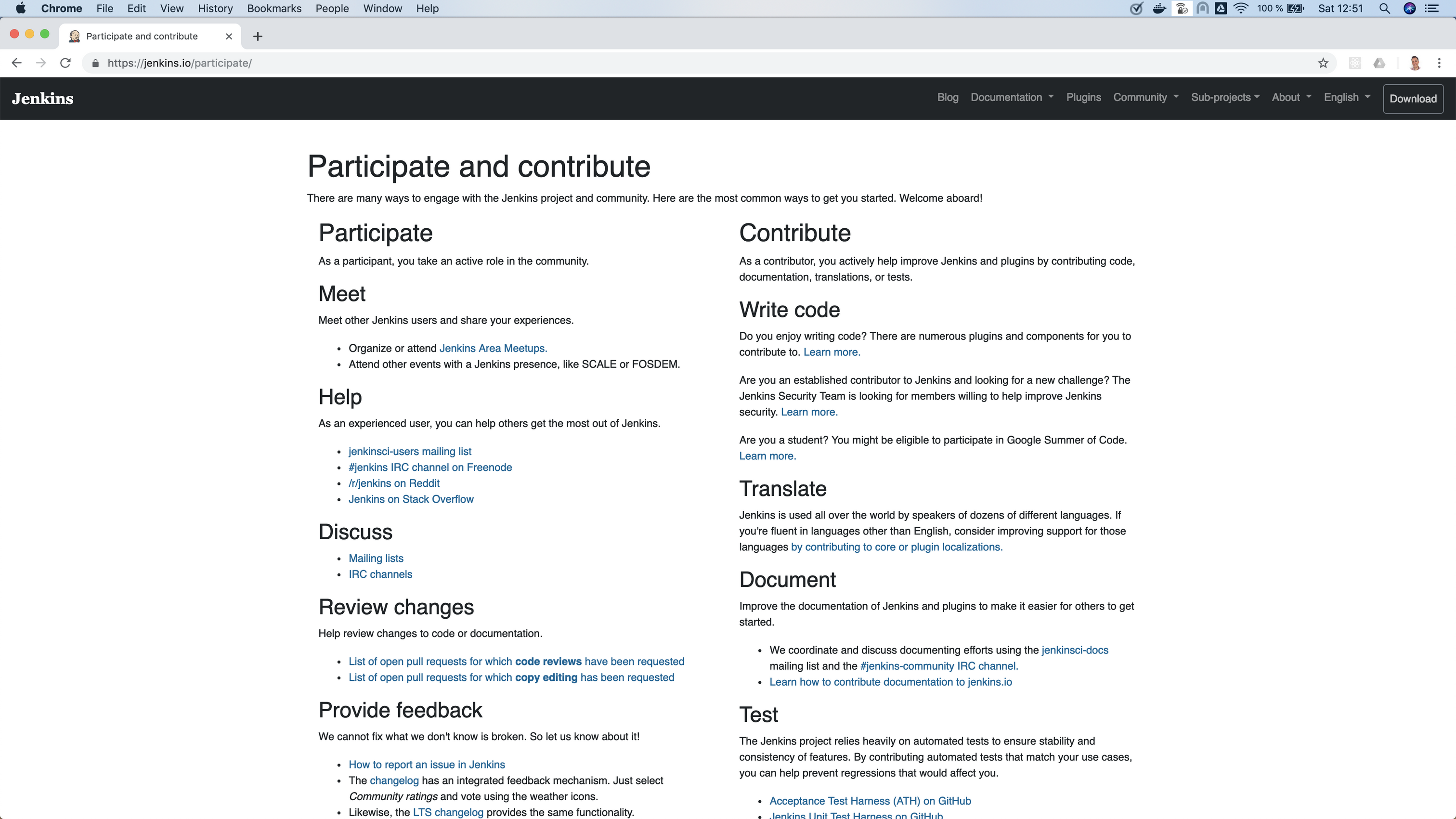 要成为 Jenkins 的贡献者,首先会看到的就是 jenkins.io, 在顶部导航中"社区"下拉列表里第一个"参与"的链接就能将我们带到"参与和贡献"这个页面。