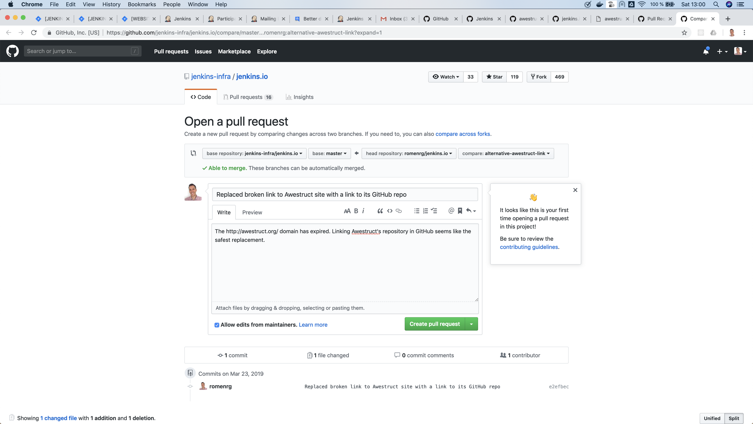 把我的改动 commit 并 push 到远程库以后,我就需要创建一个 PR 了。 有一个简单的方法,只需单击推送完成后在 git 日志中显示的链接,如果愿意的话也可以通过 GitHub UI 创建 PR; 或者甚至可以使用 GitHub CLI 的 “hub” 来完成它。